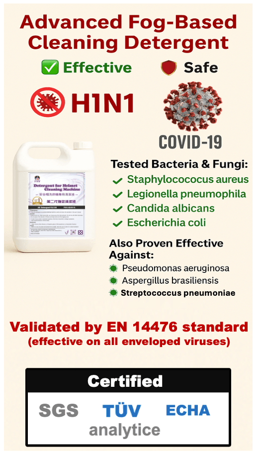 FLE-05 Helmet & Gear Cleaning Fog Liquid – Certified Antibacterial & Virucidal PerformanceOur proprietary fog liquid (FLE-05) is scientifically formulated for superior hygiene. It has passed multiple internationally recognized standards for antibacterial, antifungal, and antiviral performance: